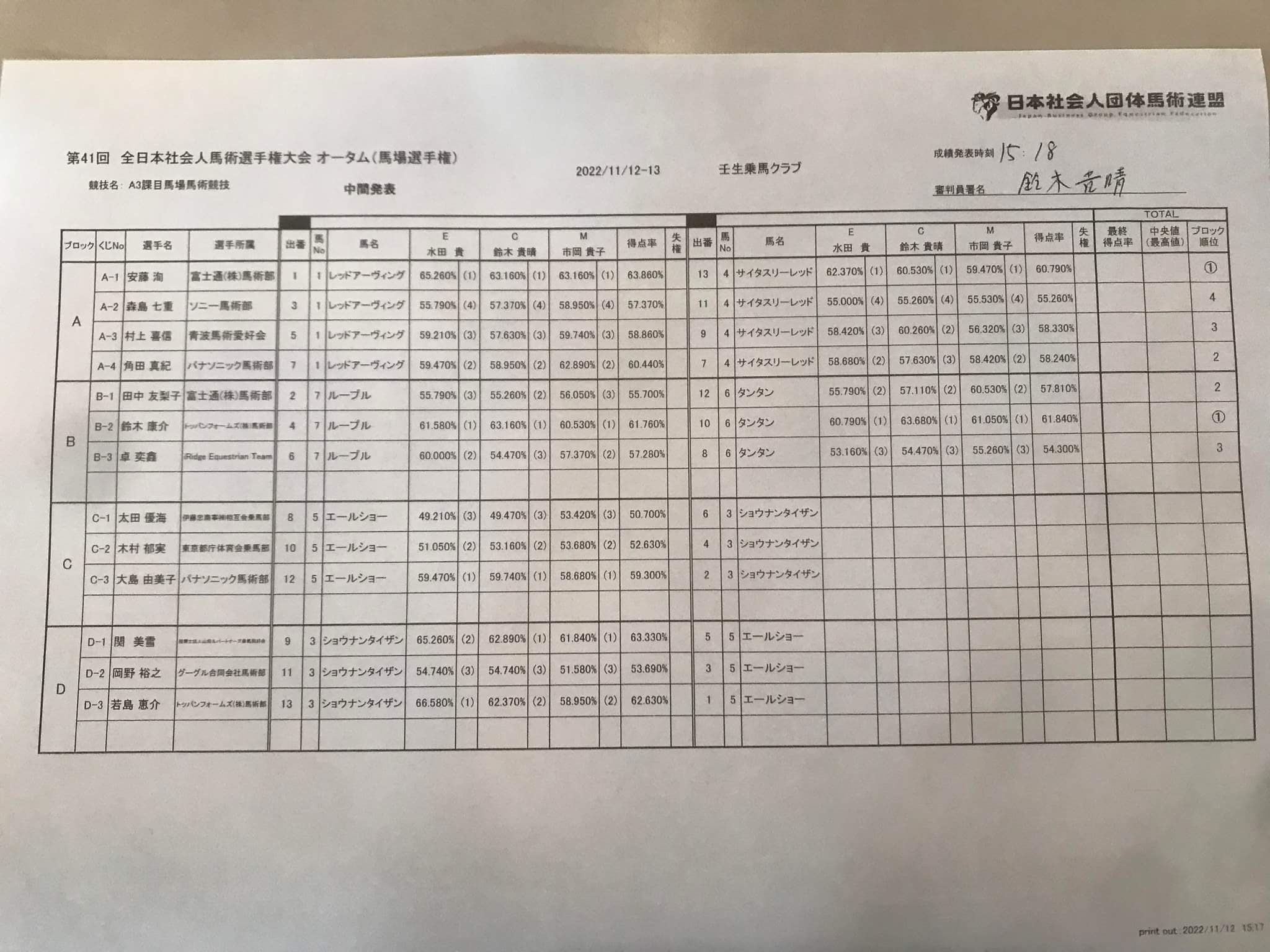 • 第41回 全日本社会人馬術選手権大会 オータム (馬場選手権) 結果 2022年11月12日