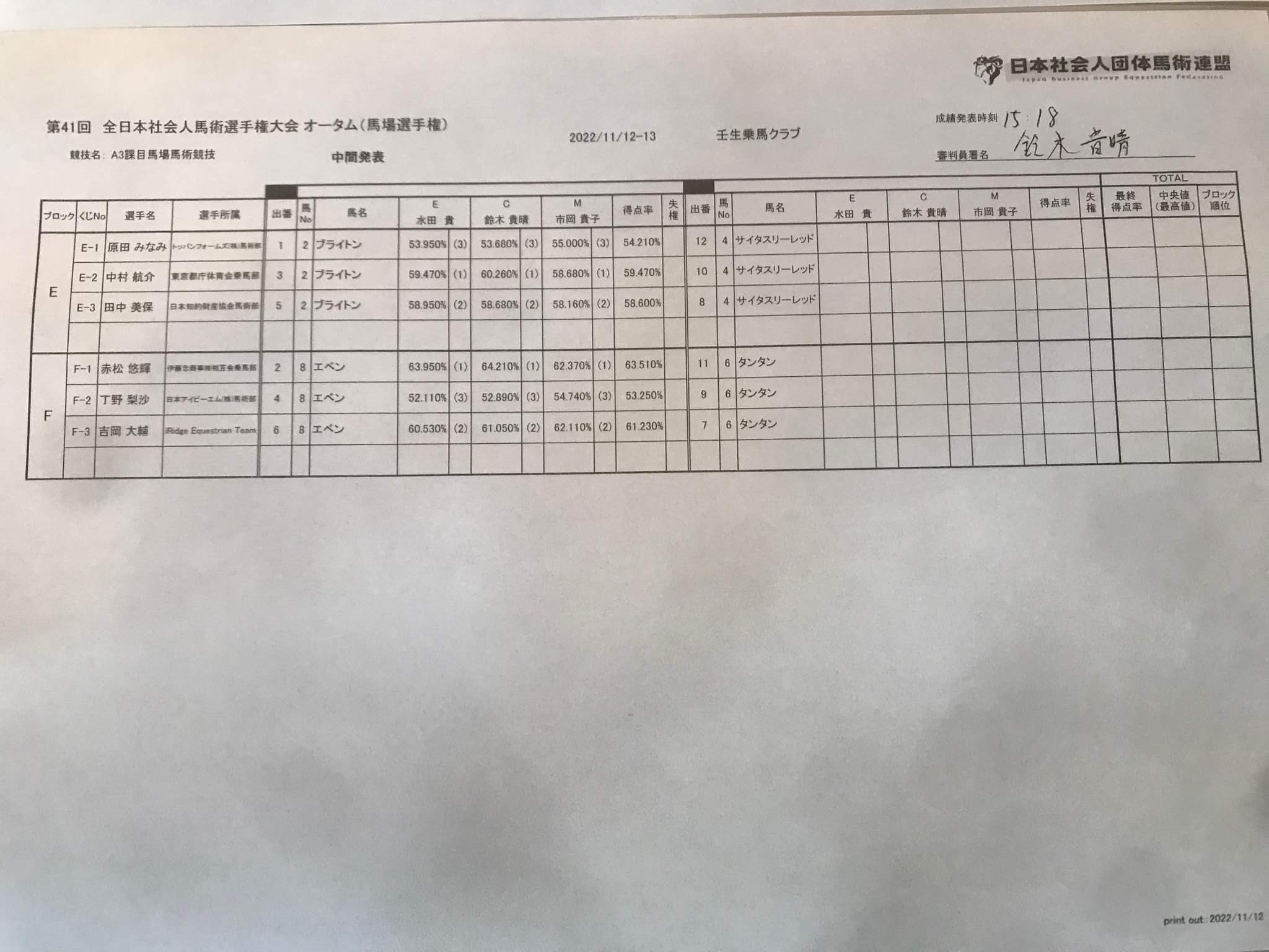• 第41回 全日本社会人馬術選手権大会 オータム (馬場選手権) 結果 2022年11月12日